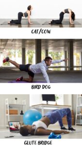 #1–Bird Dog: The Bird Dog is a core exercise that strengthens your lower back and abdominal muscles. Start on your hands and knees, with your hands under your shoulders and your knees under your hips. Lift one arm and the opposite leg at the same time, keeping your back straight and your hips level. Hold for a few seconds, then return to the starting position and repeat on the other side.